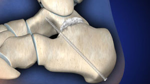 This surgical procedure is used to help relieve pain in the joint beneath the ankle joint and correct deformities in the hindfoot caused by injury, arthritis, or genetic defect. The procedure fuses the calcaneus (the heel bone) to the talus, the bone that connects the foot to the ankle.