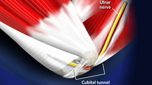 This condition is a compression injury to the ulnar nerve near the elbow. This is the nerve that produces a jolt when you bump your "funny bone."